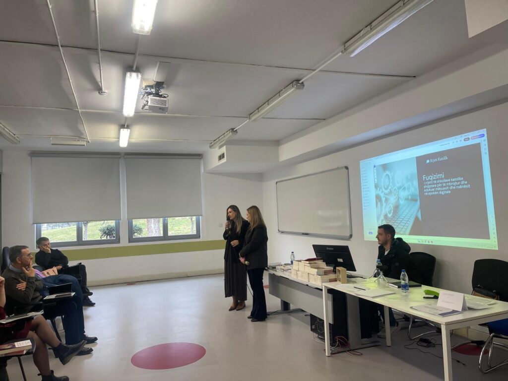 Koordinatorja e ketij projekti prane KKEKSH znj. Malvina Pergega si edhe ekspertet znj. Mariana Skenduli dhe z. Ergys Malo paraqiten objektivin e ketij projekti qe synon fuqizimin e rrjetit te shkollave katolike shqiptare per te mbrojtur dhe edukuar mesuesit dhe nxenesit ne epoken digjitale. Ky objektiv do te arrihet permes prezantimit te shkollave me mjetet e IA-se per mesim gjitheperfshires, trajnimit te mesuesve dhe udhezimeve per perdorim etik te IA-se dhe sistemeve digjitale mbrojtese.